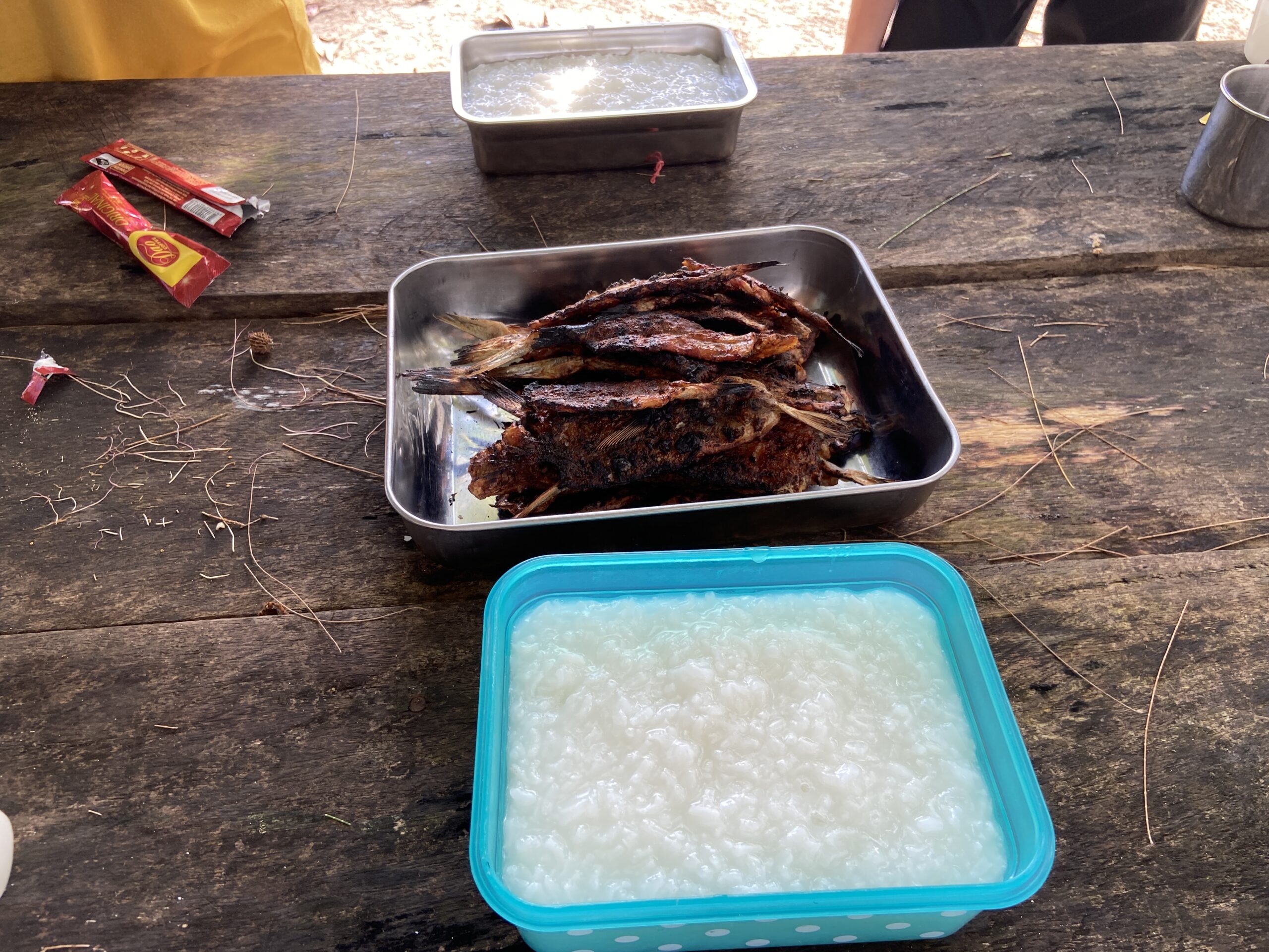 カンボジアの伝統的な朝食、ボーボー(お粥)と魚の干物を食べます。