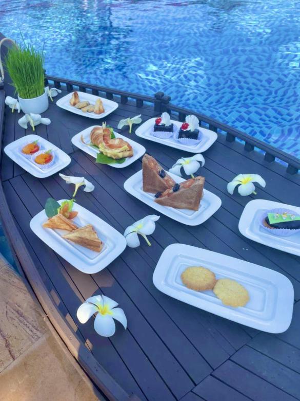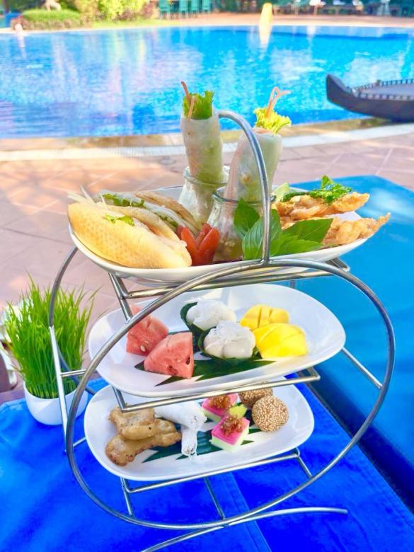 このアフタヌーンティーでは、緑に囲まれたホテルのレストランやプールサイドで、のんびりとティータイムをお楽しみいただけます。またアフタヌーンティーを予約された方は、なんとプールも無料でご利用可能! 心地よい風と水の音に癒されながら、シェムリアップならではのフローティングスタイルでおくつろぎいただけます。