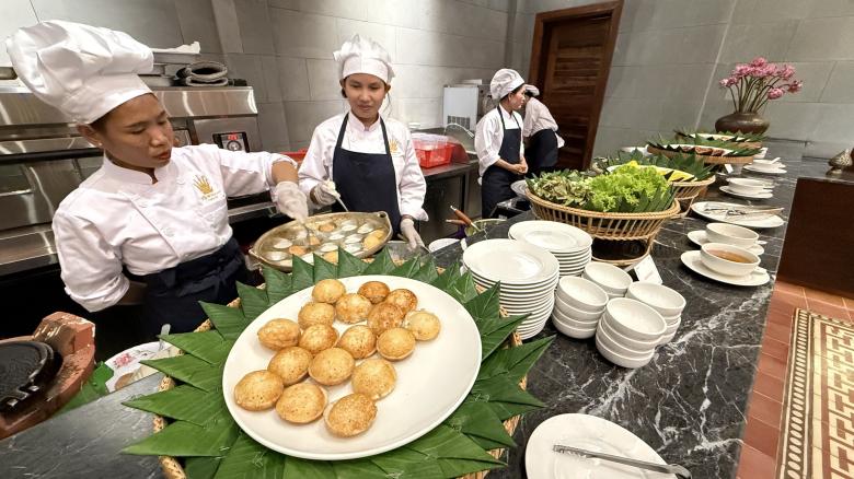 インターナショナルブッフェで、クメール料理はもちろん、西洋料理も楽しめます。ヌードル、かぼちゃプリンや豊富なデザート、出来立てのBBQやピザなど様々楽しめます。お子様連れのお客様へもおすすめです。